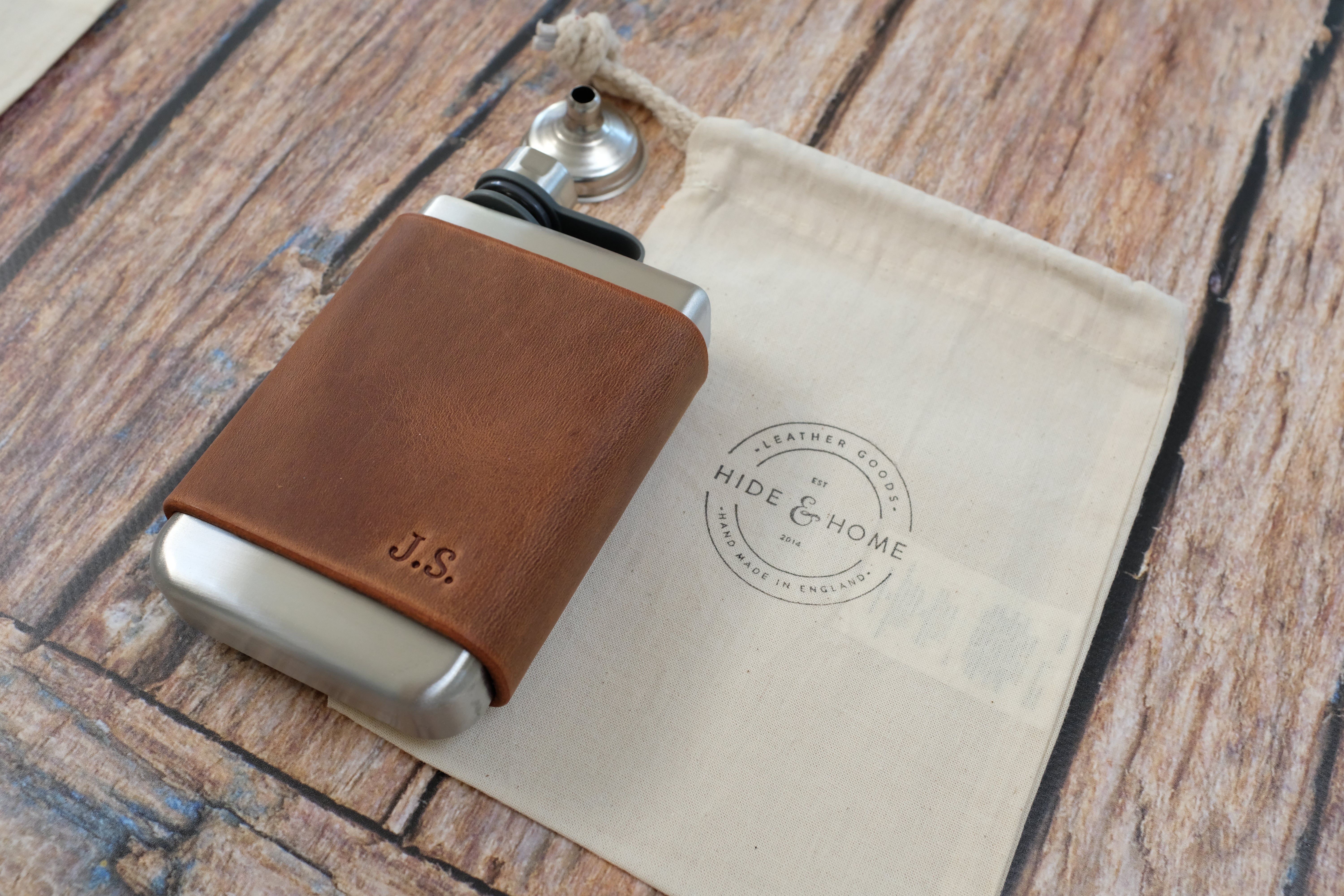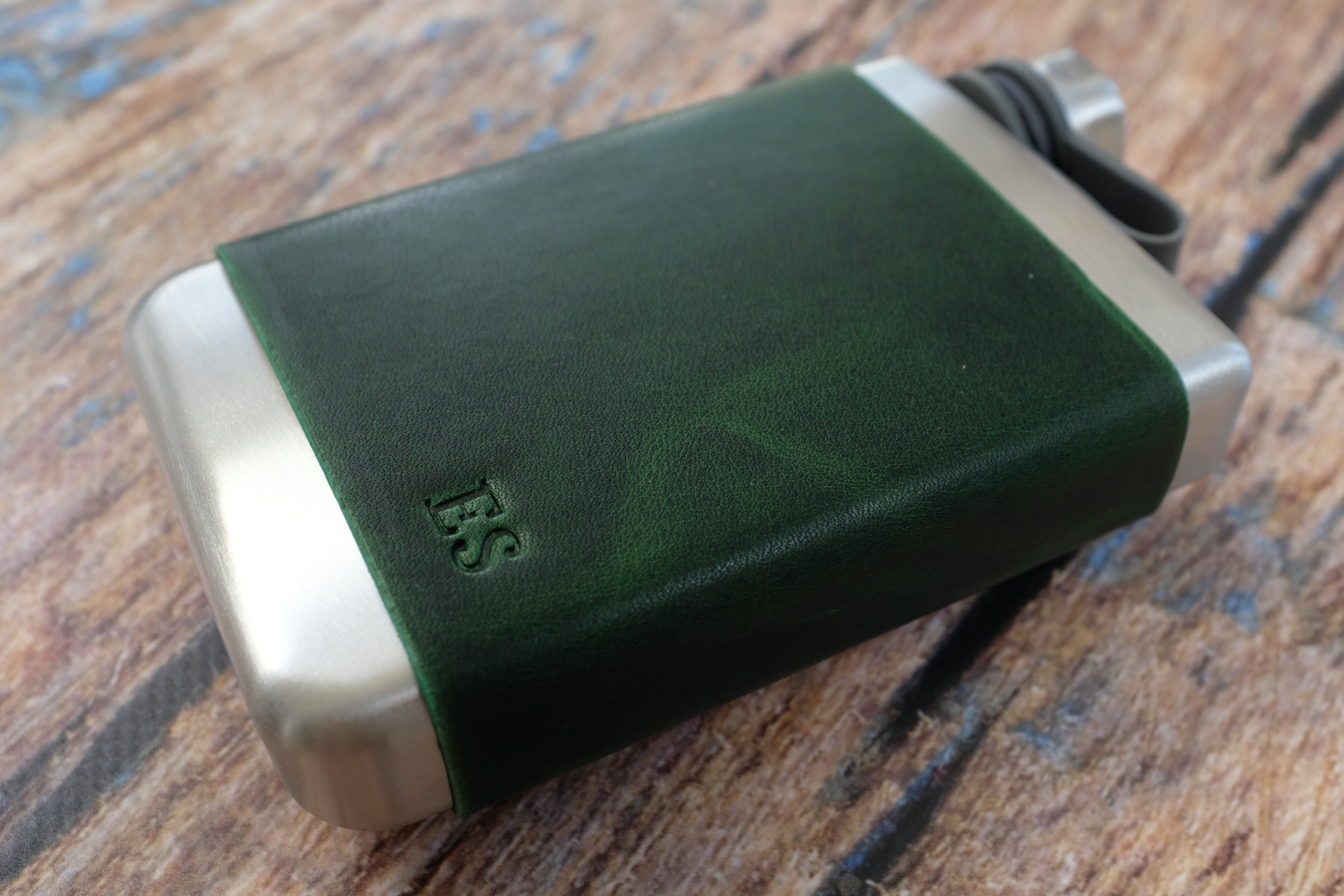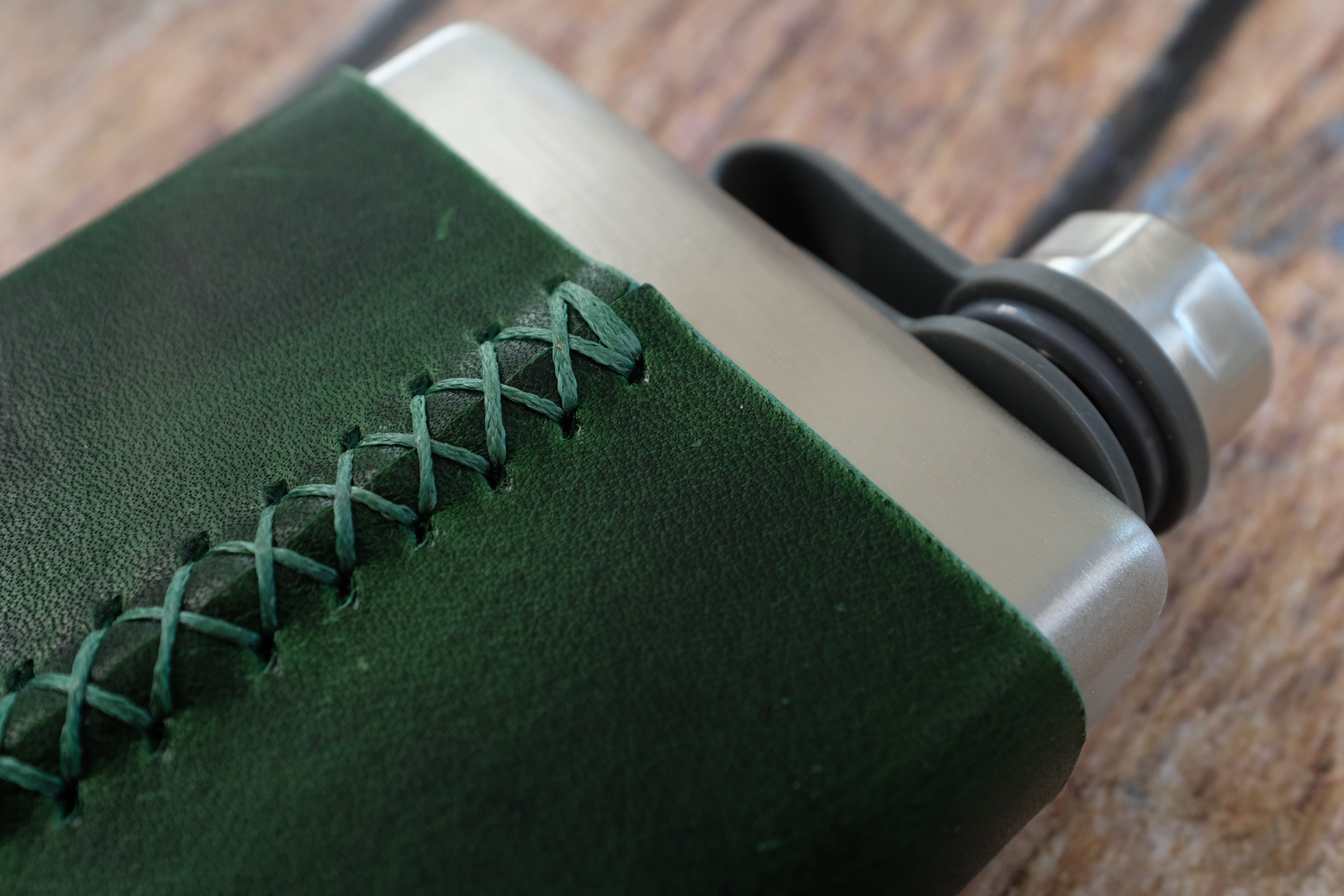 The leather is hand-cut, personalised with up to five initials, and finished with a neat, hand-stitched criss-cross seam running down the back — a small but deliberate detail that gives each flask its own character. The thread will colour match as closely as possible to the leather colour. Every stitch, mark, and edge speaks of the maker’s hand.